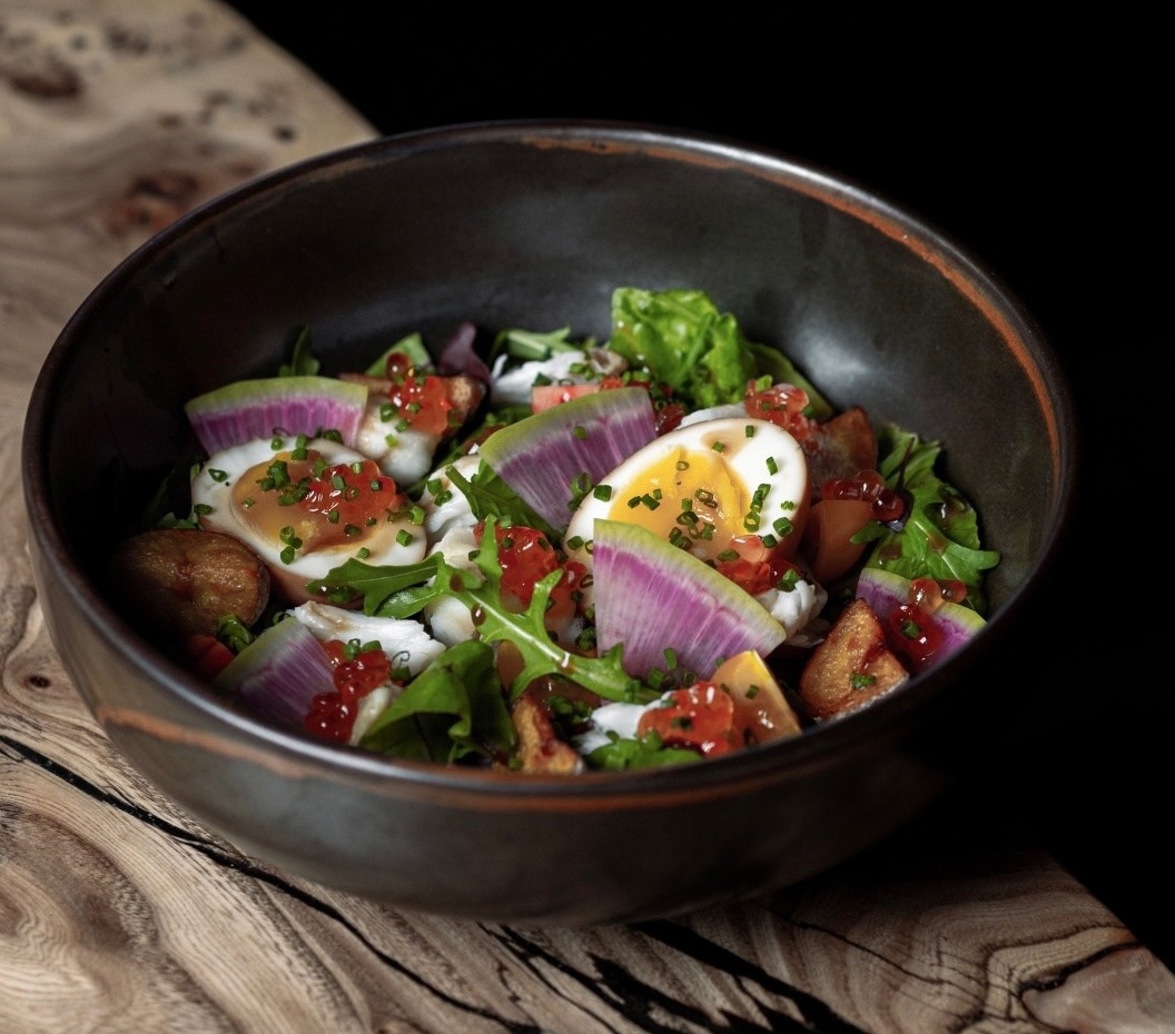 В меню войдут салаты, супы и вторые блюда. В салат «Нисуаз» вместо традиционного консервированного тунца добавили камчатского краба и красную икру с маринованным яйцом и арбузной редькой. В классический европейский тартар вошла стружка тунца и жареного угря, блюдо подаётся с соусом-коллаборацией — унаги и чёрным трюфелем, и муссом из пармезана.