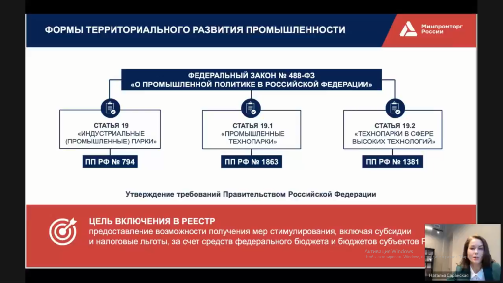 В прямом эфире спикер рассказала о преимуществах строительства промышленных и индустриальных парков, о формах территориального развития промышленности, привела статистику по региональной промышленной инфраструктуре, а также схематически показала распределение парков по стране.