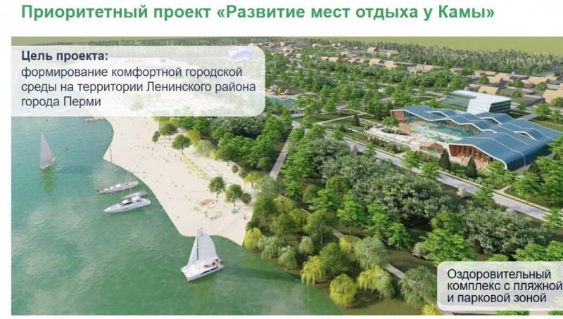 В Ленинском районе Перми выделены два приоритетных проекта в рамках развития территории. Самый масштабный среди них – «Развитие мест отдыха у Камы». Он включает в себя строительство оздоровительного комплекса с пляжной и парковой зонами.