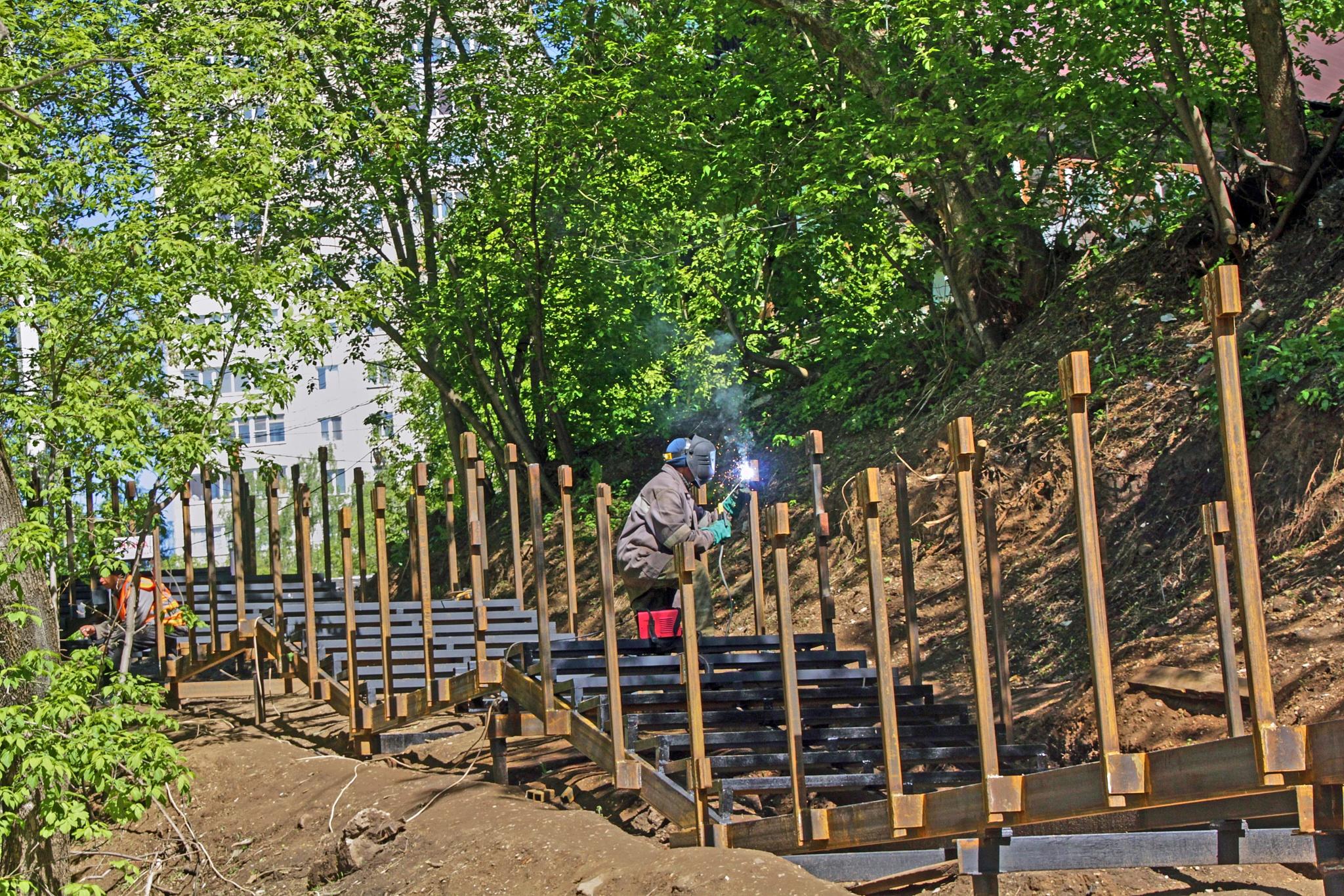 Глава города напомнил, что всего в долине реки Данилихи планируется облагородить три участка — сквер Каменских, парк у Центрального рынка и Серебрянский парк. В сквере Каменских уже монтируют металлокаркас конструкций экотропы (на фото), а также прокладывают системы освещения и видеонаблюдения. В Серебрянском парке планируется построить пешеходную и велосипедную дорожки, оборудовать велопарковки, смонтировать переходы, системы видеонаблюдения, освещения и навигации, детскую и спортплощадку, визит-центр.