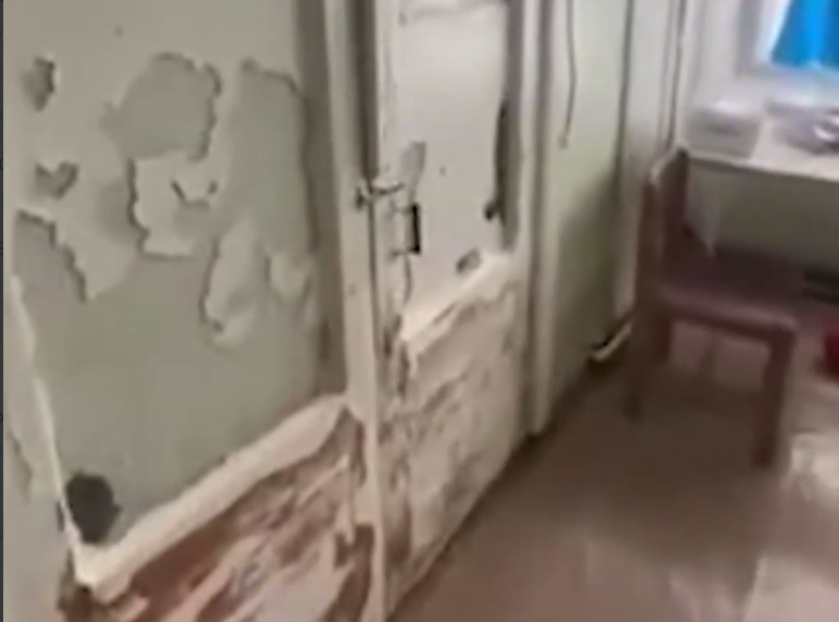 На кадрах видно, что со стен отваливается краска, в полу и на стенах есть дыры (пациенты заклеили их скотчем, чтобы хоть как-то сохранить тепло), а на потолке — плесень. По словам женщины, когда её ребёнка госпитализировали, смыв унитаза не работал. Его починили после, привязав верёвку.